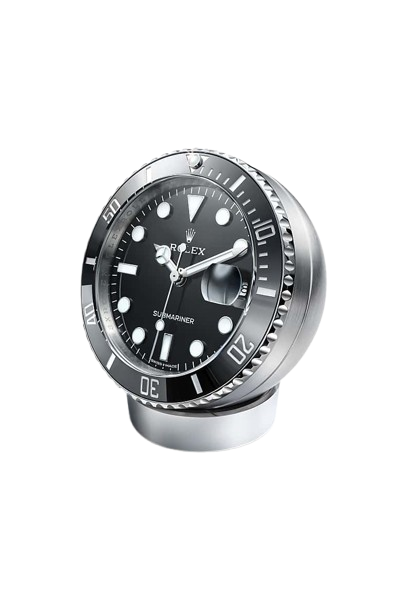 Thi Submariner desk clock in stainless steel, with a Cerachrom bezel insert and Chtimalight display, incorporates a secular calendar.